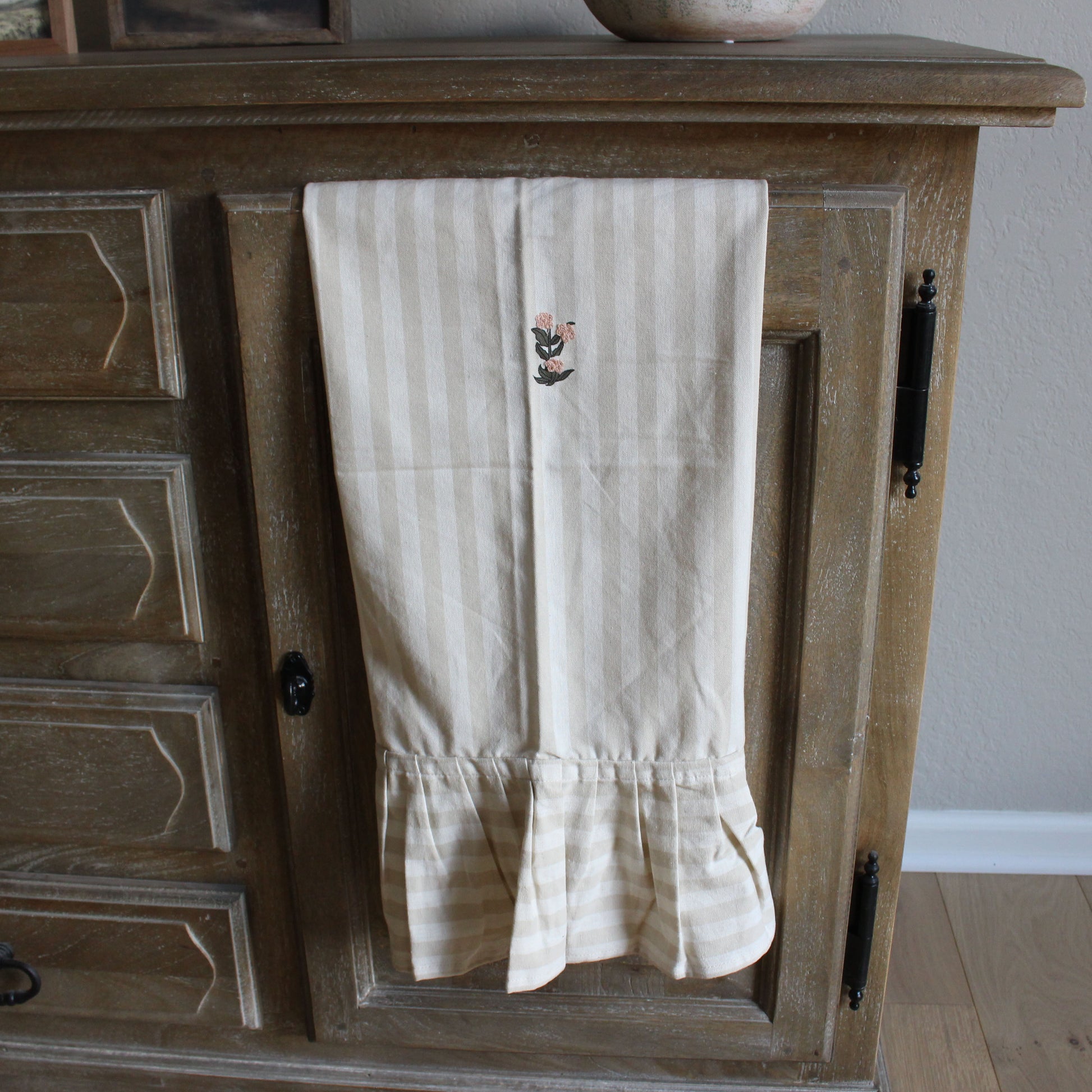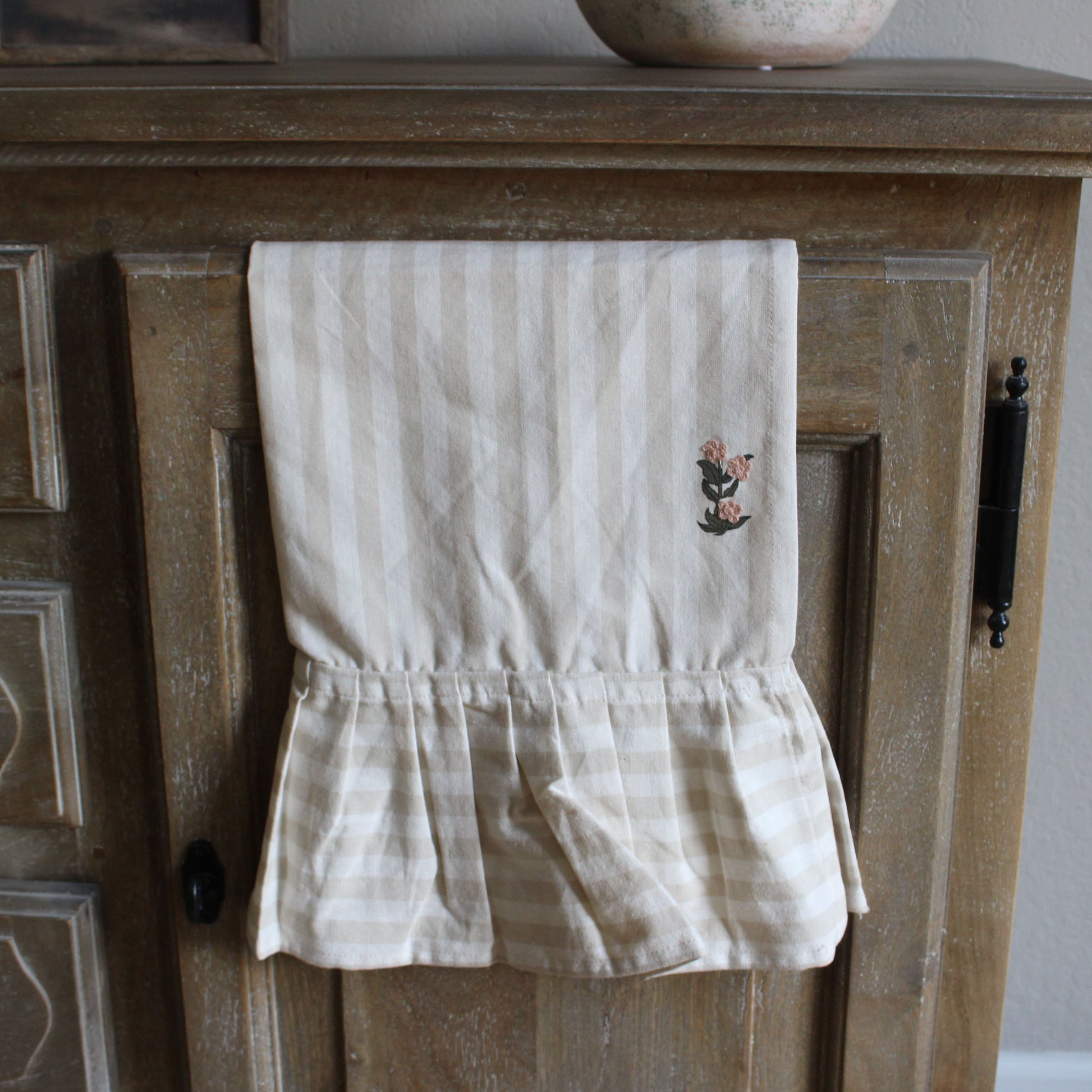 Who says kitchen towels can’t be stylish? This vintage-inspired tea towel is ready to steal the show with its soft beige stripes, delicate ruffled bottom edge, and dainty embroidered flowers. Equal parts practical and pretty, it’s the kind of towel you’ll almost not want to use—because it looks that good hanging from your oven door.